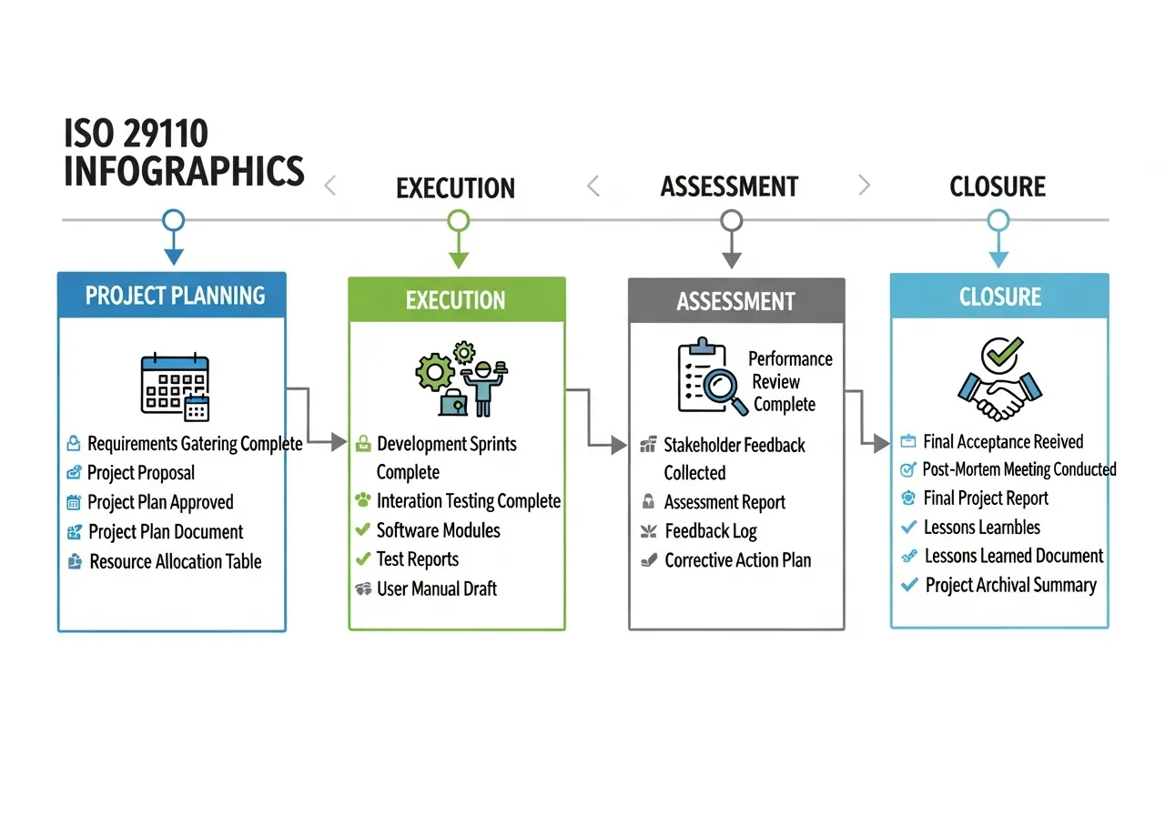 ISO 29110 เป็นมาตรฐานสากลที่เน้นเรื่องกระบวนการวงจรชีวิตของซอฟต์แวร์ สำหรับหน่วยงานขนาดเล็ก (VSEs) โดยเฉพาะ สิ่งที่ทำให้มาตรฐานนี้ช่วยลด ความเสี่ยงจ้างทำแอป ได้อย่างชะงัด คือข้อกำหนดที่ Software House ต้องปฏิบัติ ดังนี้:
